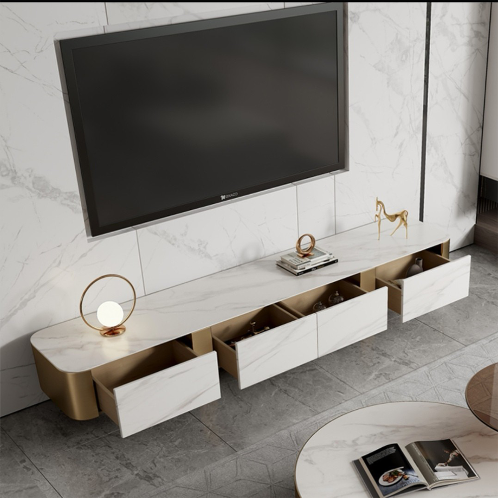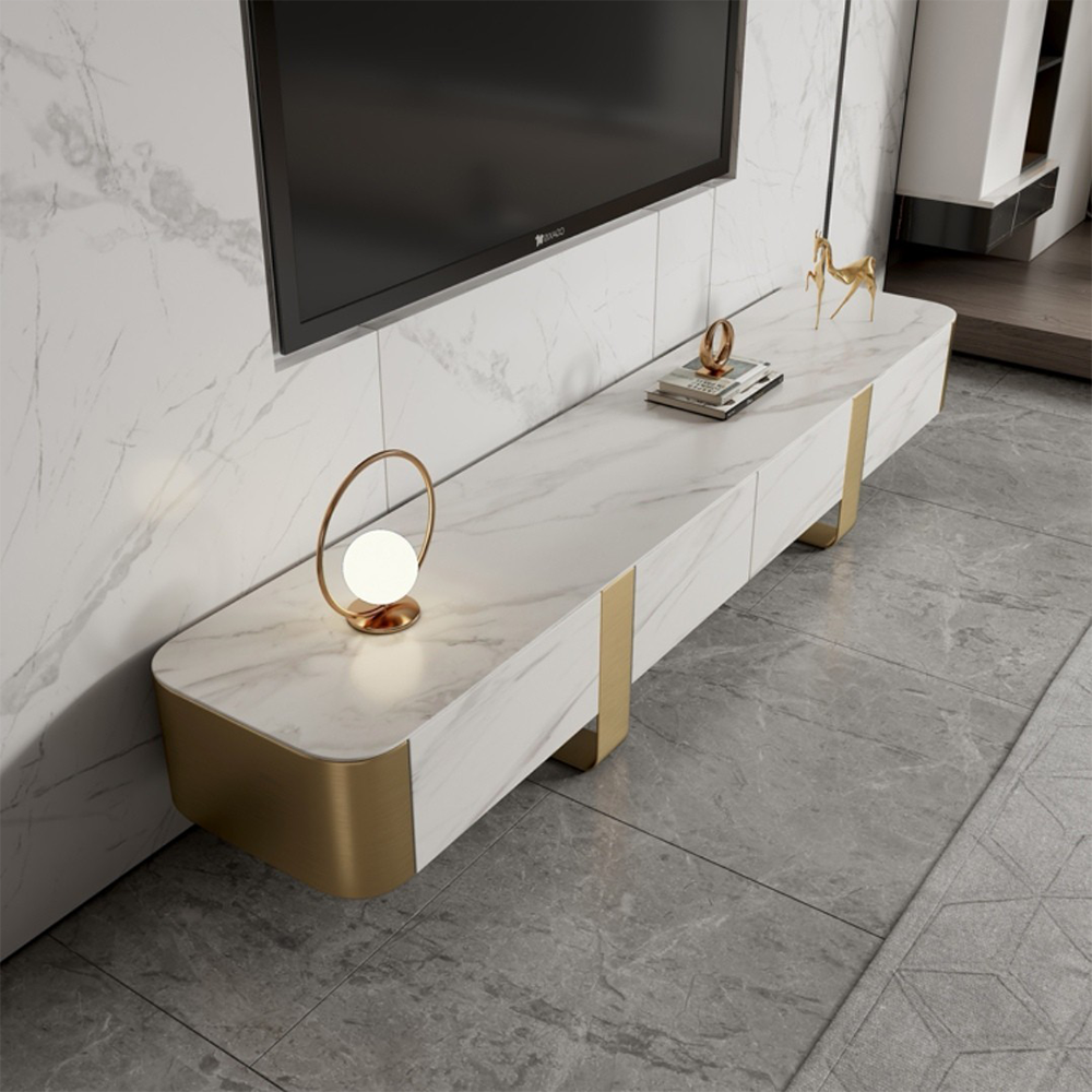 ชั้นวางทีวีท็อปหินชนวนอิตาลี แต่งด้วยสแตนเลสสีทองชุบไทเทเนียม ลิ้นชักโครงไม้สน มี 3 ขนาด