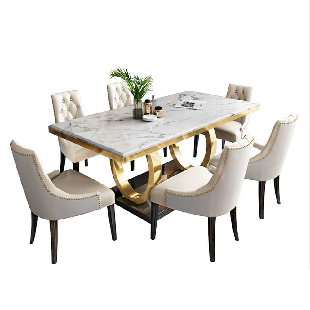 เซ็ทโต๊ะกินข้าว+เก้าอี้4ตัว หน้าหินธรรมชาติ ขาแสตนเลส เก้าอี้เบาะหนัง